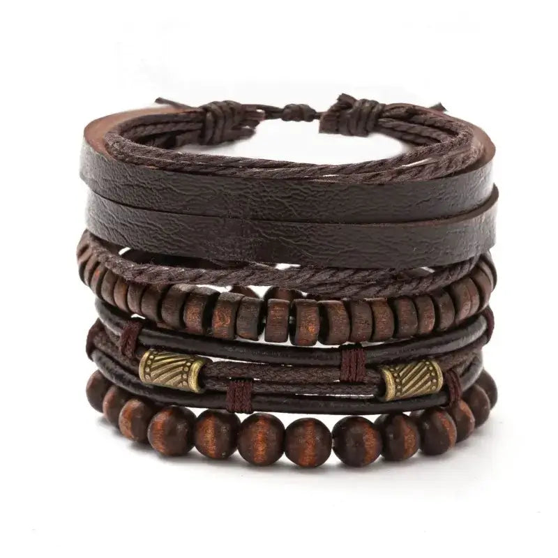 - 4 pulseiras com variações de contas de madeira, couro sintético e detalhes artesanais.