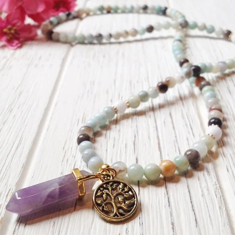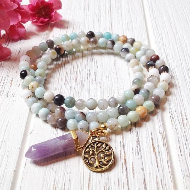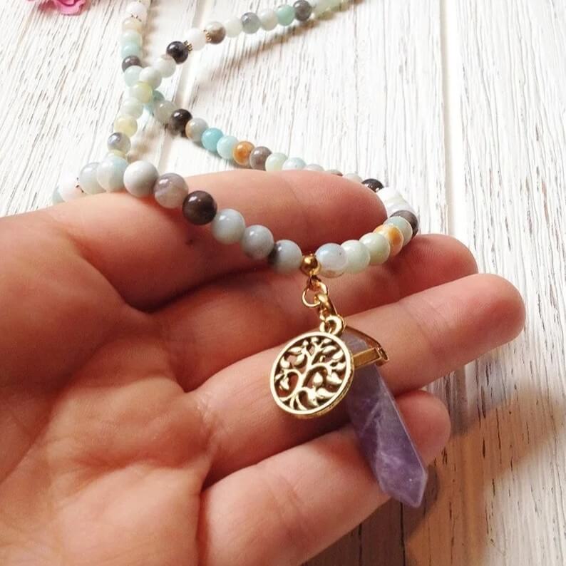 - 01 Japamala 108 Contas em Pedras Naturais Amazonita e Pingente em Ametista