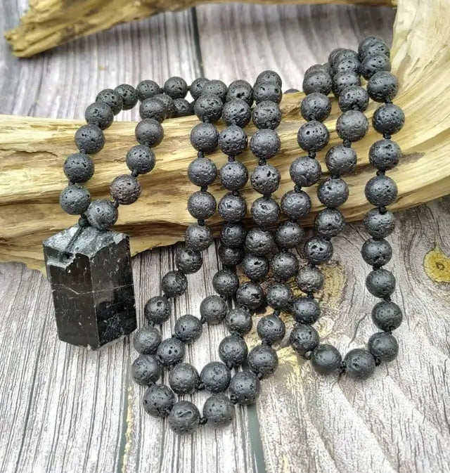 Material: Contas em Lava vulcânica e Pedra em Turmalina Negra Bruta