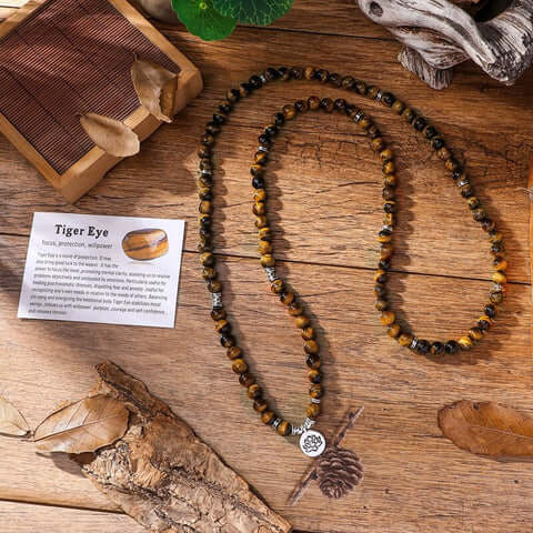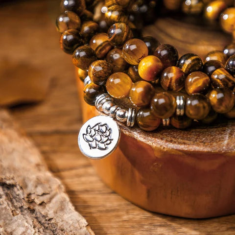 01 Japamala Tibetano com Pedras Olho de Tigre, Pingente Árvore da Vida, Buda, Lótus ou Om