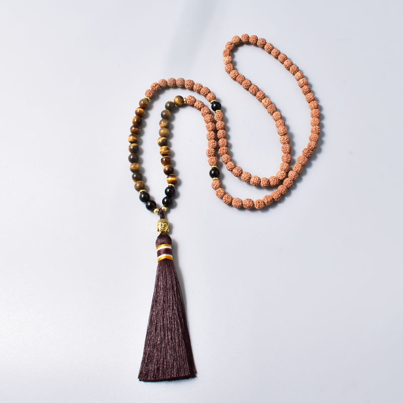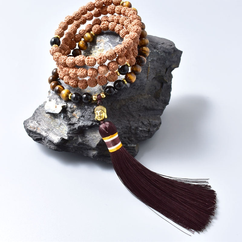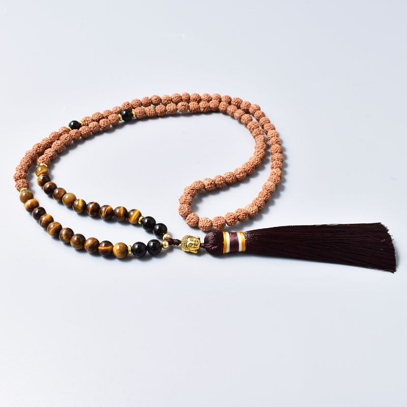 01 Japamala com 108 Contas em Rudraksha, Olho de Tigre e Ônix Naturais