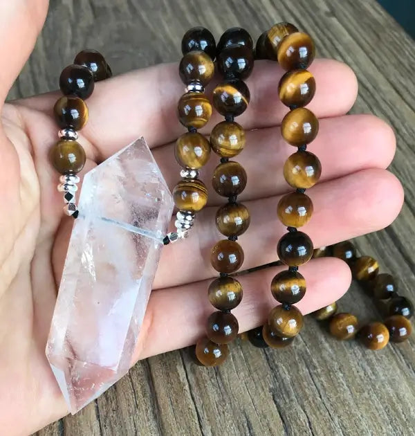 Japamala com 108 Contas Olho de Tigre e Pedra Natural Quartzo Cristal - Linha Cristais