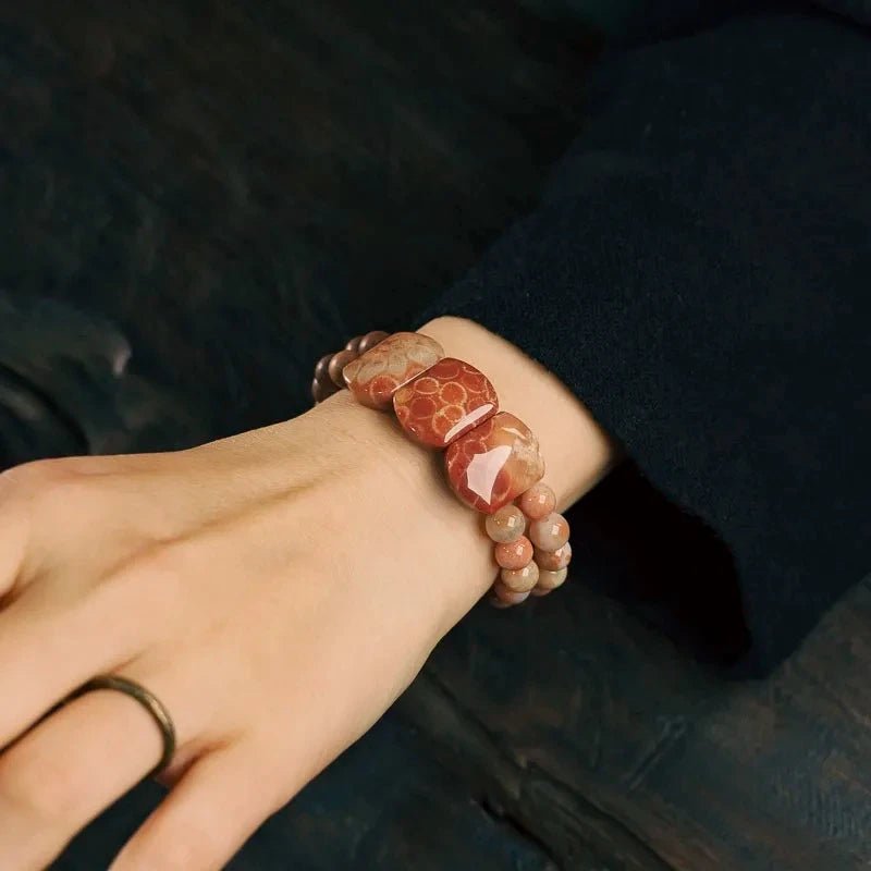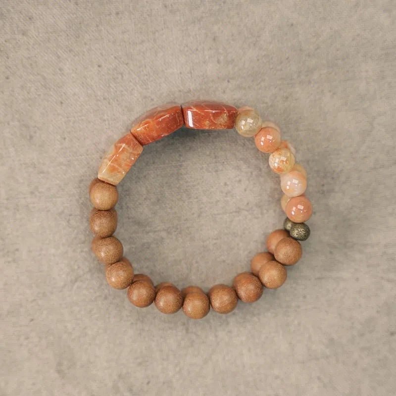 Design e Conforto: Combinando contas de coral e madeira Sândalo em uma dupla camada, este bracelete não apenas se ajusta visualmente a diversos estilos, mas também proporciona um uso confortável em qualquer ocasião.