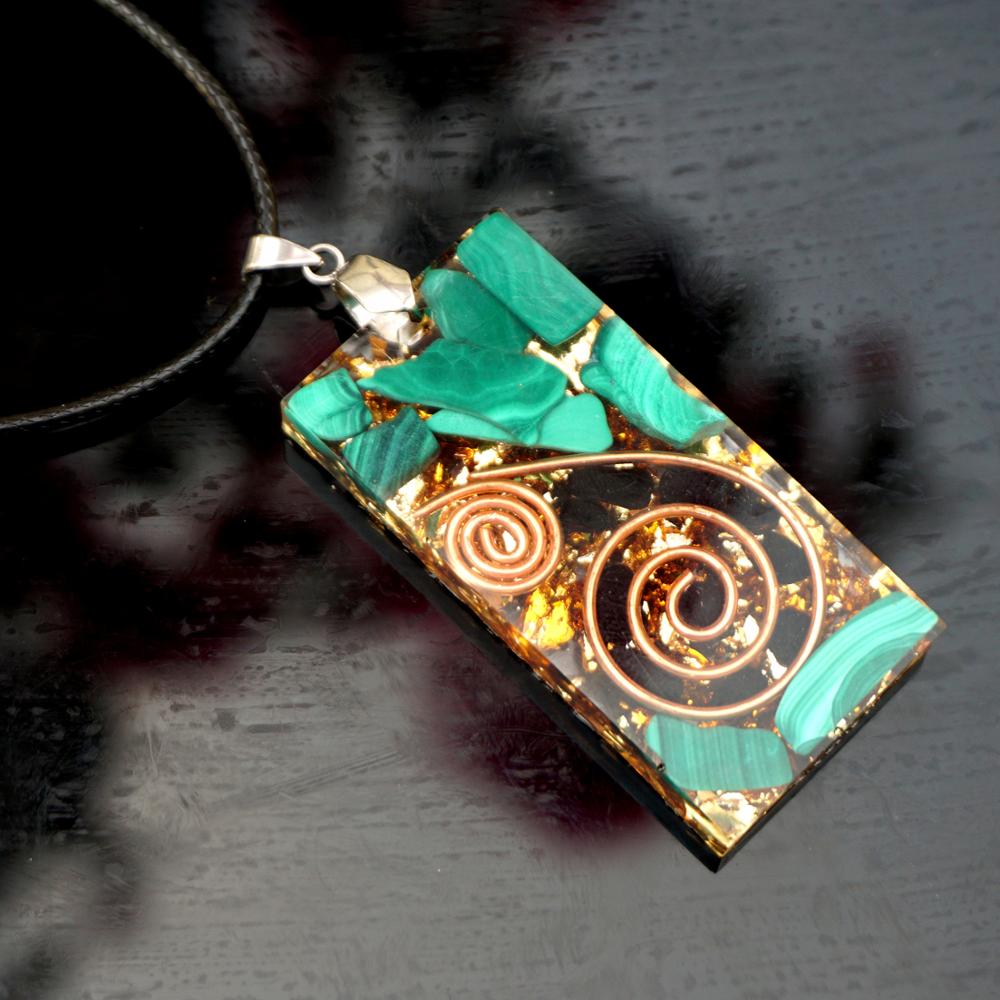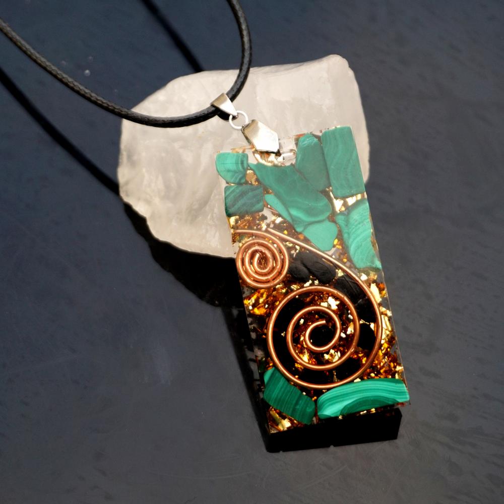 Este pingente Orgone é feito com pedras naturais turmalina negra, malaquita, cristal de rocha e cobre.