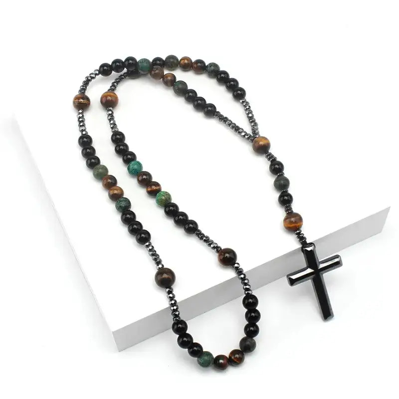 - Material: Pedras Naturais (Turquesa Africana, Ônix Preto, Olho de Tigre) e cruz em hematita.
